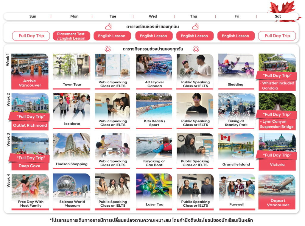 - ทัศนศึกษาสุดสัปดาห์ถึง 4 ครั้งได้แก่ เดินทางไปเล่นสกีบนเขา Grouse Mountain, เดินทางไป Lynn Canyon Suspension Bridge / Deep Coven, One Day Trip เกาะ Victoria และปั้นจักรยานที่ Stanley Park